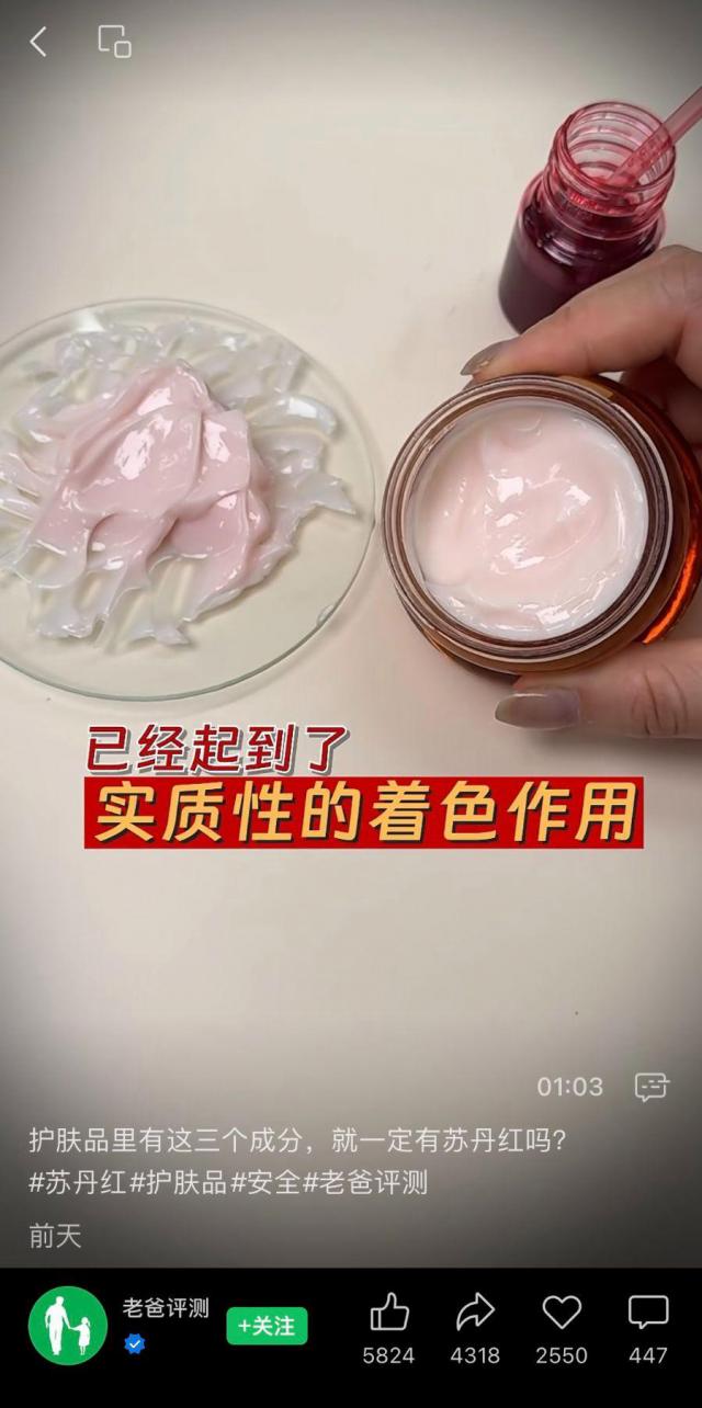 "老爸评测"发布的视频指出,其实验室在对一款肉色护肤品进行检测时,意外检出了禁用成分苏丹红。