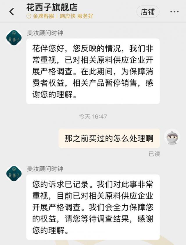花西子品牌旗舰店客服回复记者称:"已对相关原料供应企业开展严格调查。在此期间,为保障消费者权益,相关产品暂停销售"。