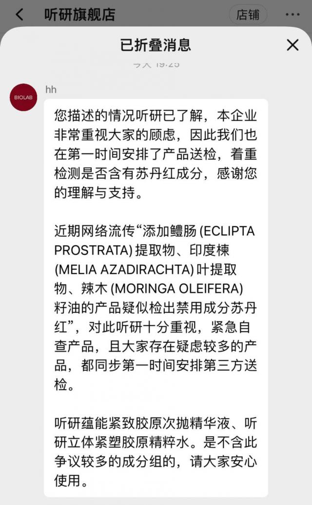 听研品牌旗舰店客服回复记者称,"在第一时间安排了产品送检,着重检测是否含有苏丹红成分","紧急自查产品,且大家存在疑虑较多的产品,都同步第一时间安排第三方送检"。