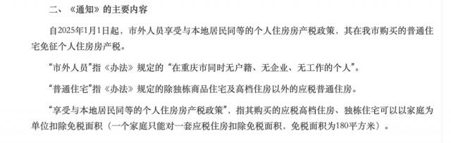 最近一次修改是今年 5 月 16 日,重庆市人民政府办公厅发布《关于市外人员购买普通住宅免征个人住房房产税的通知》,自 2025 年 1 月 1 日起,市外人员享受与本地居民同等的个人住房房产税政策,其在重庆购买的普通住宅免征个人住房房产税。
